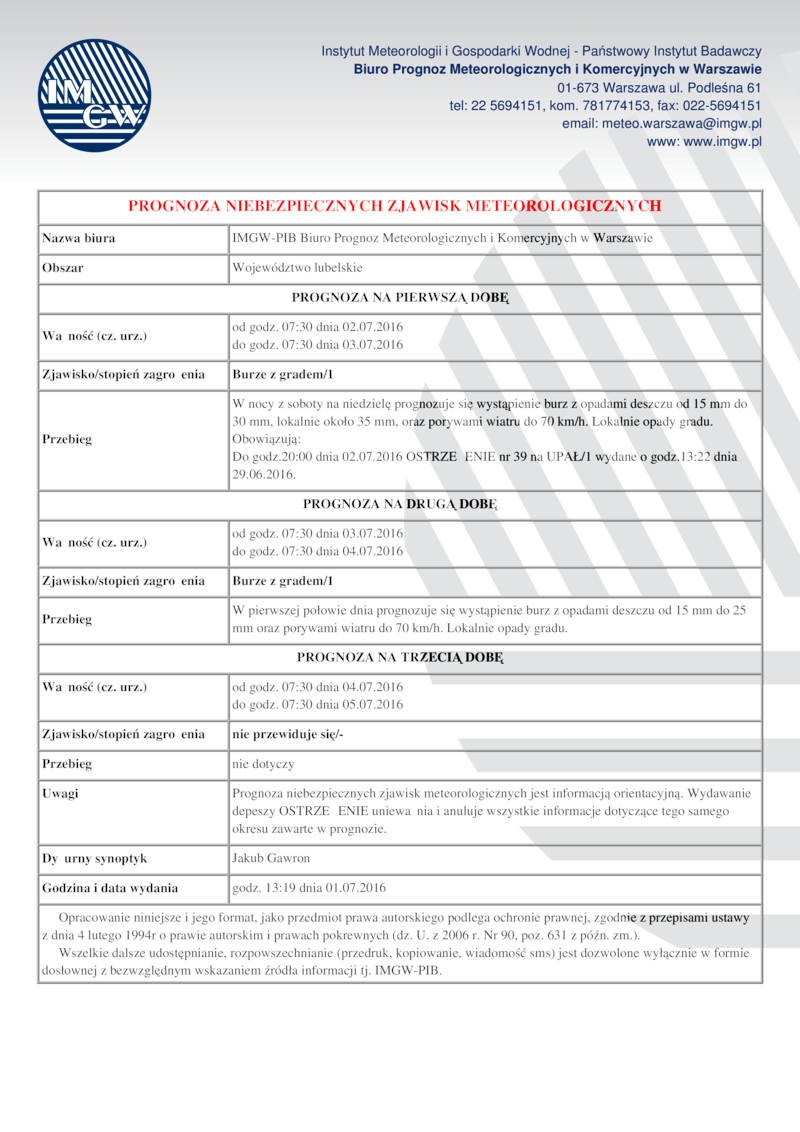 Do godz.20:00 dnia 02.07.2016 OSTRZEŻENIE nr 39 na UPAŁ/1 wydane o godz.13:22 dnia
