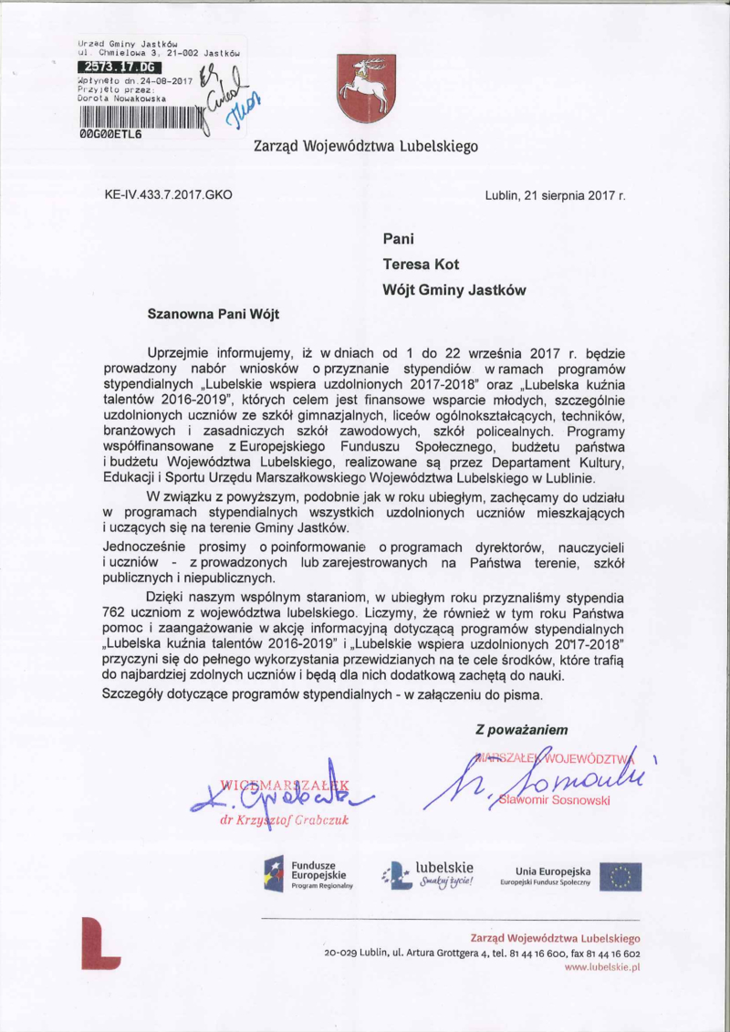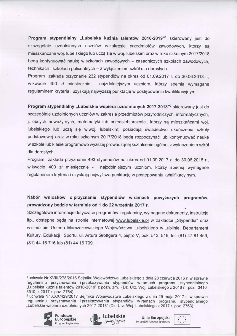 ROZPOCZYNA SIĘ NABÓR WNIOSKÓW NA PROGRAMY STYPENDIALNE W RAMACH "LUBELSKIE WSPIERA UZDOLNIONYCH 2017-2018" ORAZ "LUBELSKA KUŹNIA TALENTÓW 2016 - 2019"