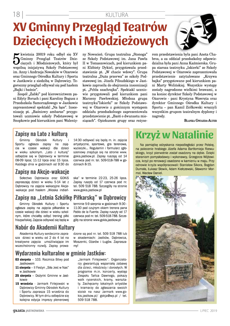 Szanowni Państwo na łamach lipcowego wydania Gazety Jastkowskiej Nr 2 (70) opublikowany został nieprawdziwy temat artykułu pn. "Krzyż w Natalinie".