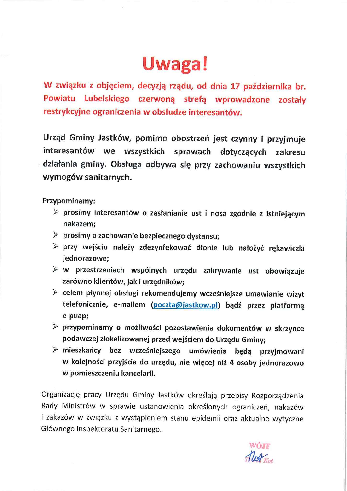 W związku z objęciem, decyzją rządu, od dnia 17 października br. Powiatu Lubelskiego czerwoną strefą wprowadzone zostały restrykcyjne ograniczenia w obsłudze interesantów.