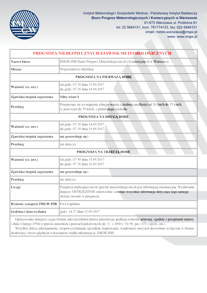 Prognozuje się wystąpienie silnego wiatru w porywach do 70 km/h.