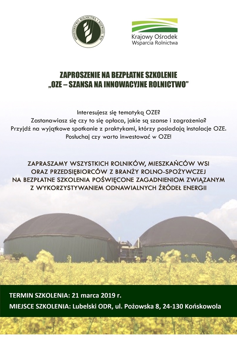 ZAPROSZENIE NA BEZPŁATNE SZKOLENIE "OZE - SZANSA NA INNOWACYJNE ROLNICTWO"