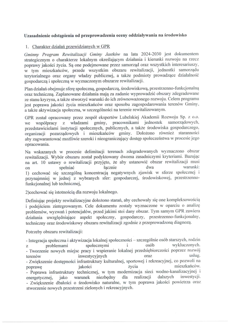 Na podstawie art. 48 ust. 7 ustawy z dnia 3 października 2008 r. o udostępnianiu informacji o środowisku i jego ochronie, udziale społeczeństwa w ochronie środowiska oraz o ocenach oddziaływania na środowisko (Dz. U. z 2023 r. poz. 1094, z późn. zm.) informuje się o odstąpieniu od przeprowadzenia strategicznej oceny oddziaływania na środowisko dla projektu „Gminnego Programu Rewitalizacji Gminy Jastków na lata 2024-2030”.