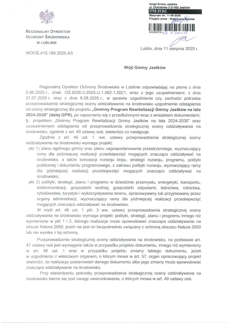 OBWIESZCZENIE WÓJTA GMINY JASTKÓW O ODSTĄPIENIU OD PRZEPROWADZENIA STRATEGICZNEJ OCENY ODDZIAŁYWANIA NA ŚRODOWISKO DLA PROJEKTU GMINNEGO PROGRAMU REWITALIZACJI GMINY JASTKÓW NA LATA 2024-2030