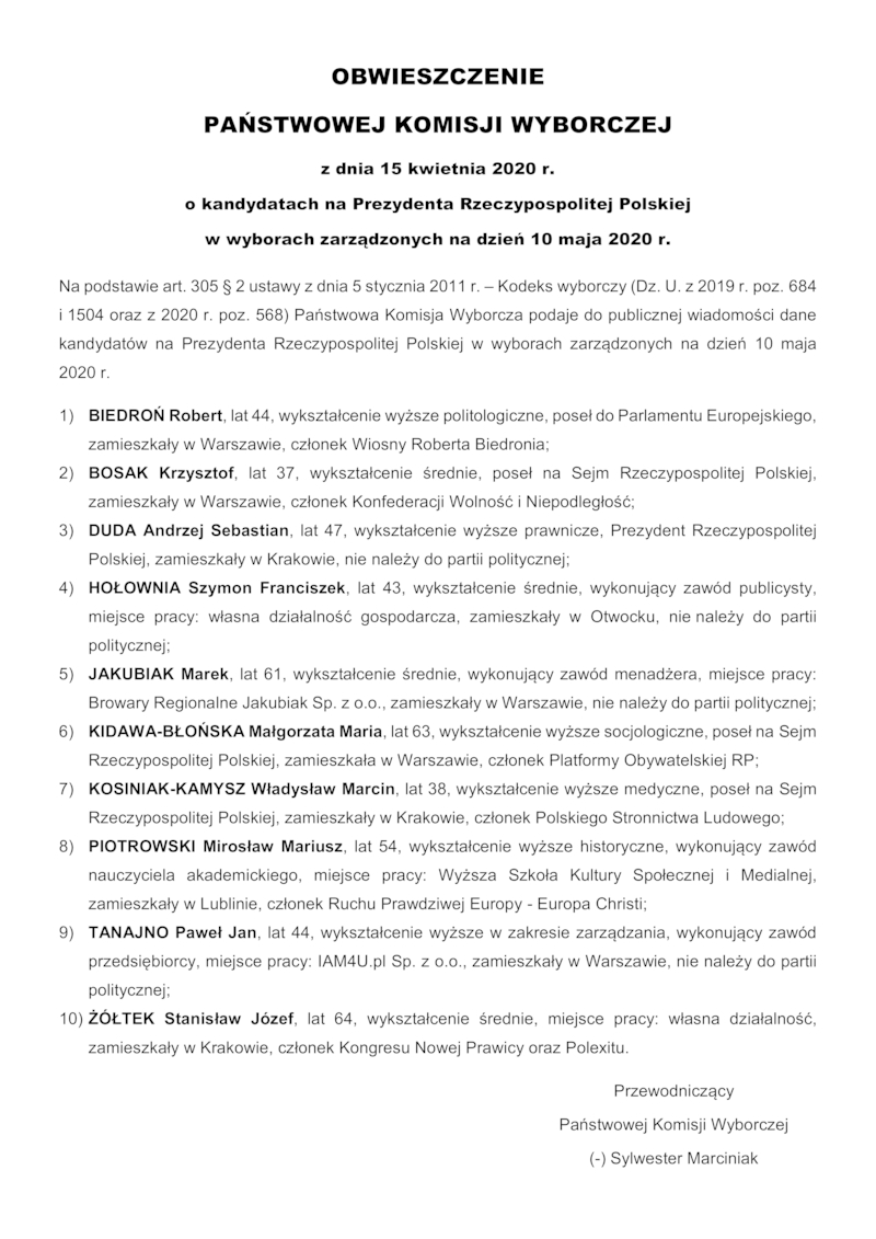 OBWIESZCZENIE PAŃSTWOWEJ KOMISJI WYBORCZEJ Z DNIA 15 KWIETNIA 2020 R. O KANDYDATACH NA PREZYDENTA RZECZYPOSPOLITEJ POLSKIEJ.