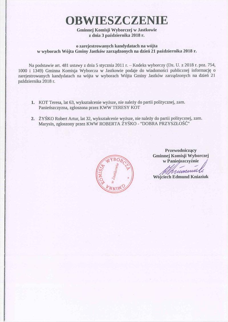 OBWIESZCZENIE GKW W JASTKOWIE Z DN. 3.10.2018R. - WÓJT GMINY JASTKÓW