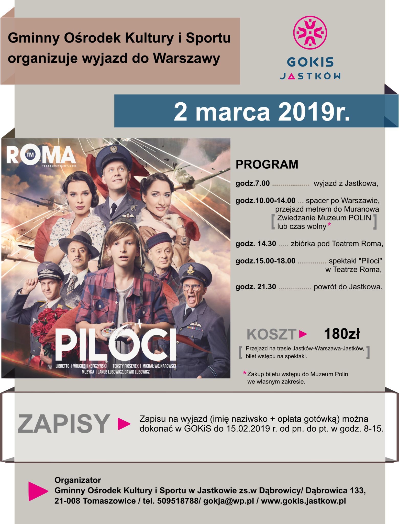 GMINNY OŚRODEK KULTURY I SPORTU ORGANIZUJE WYJAZD DO TEATRU ROMA W WARSZAWIE NA SPEKTAKL "PILOCI"