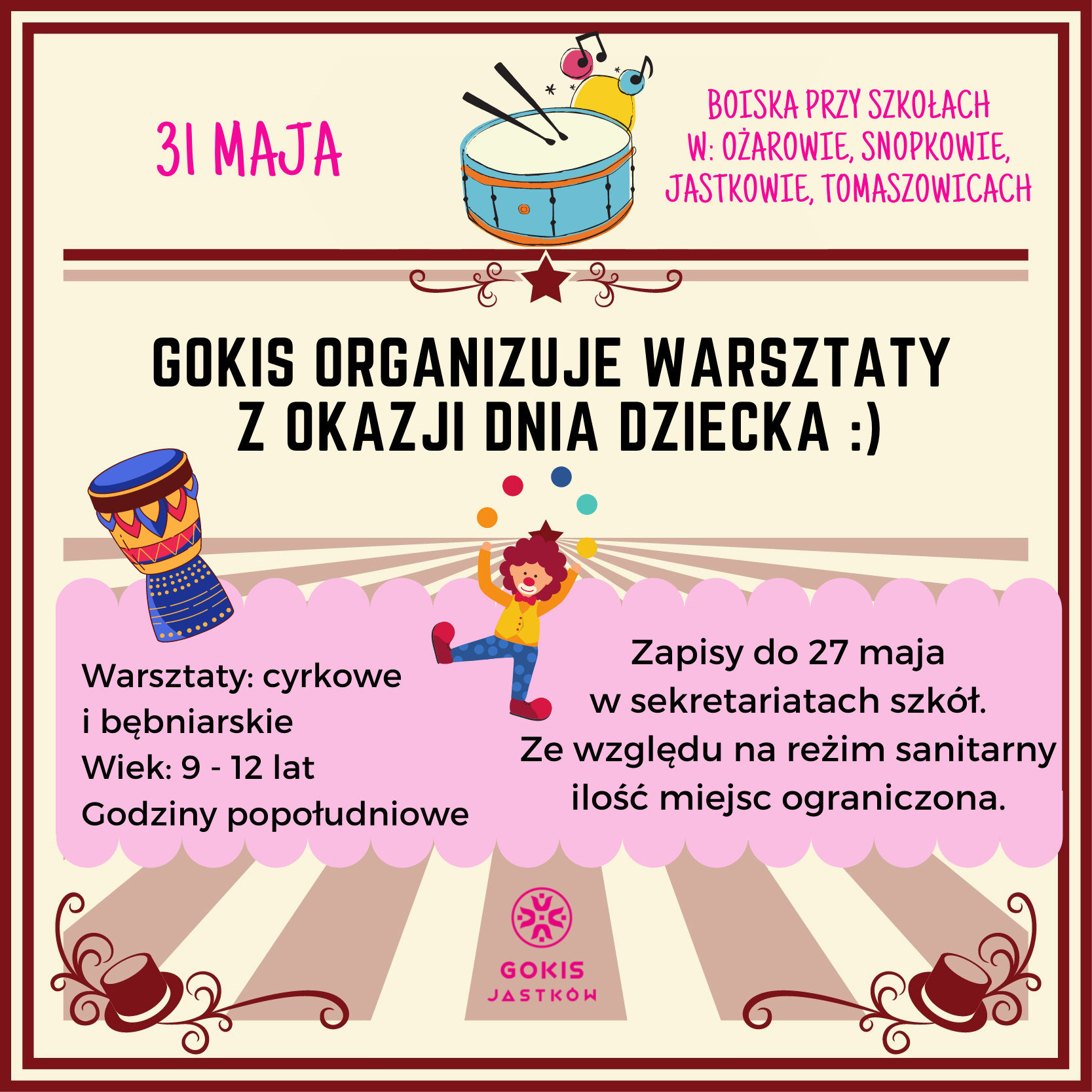 Gminny Ośrodek Kultury i Sportu zaprasza na warsztaty bębniarskie i cyrkowe z okazji Dnia Dziecka, które odbędą się 31 maja przy szkołach w Gminie Jastków oraz 2 czerwca przy GOKiS.