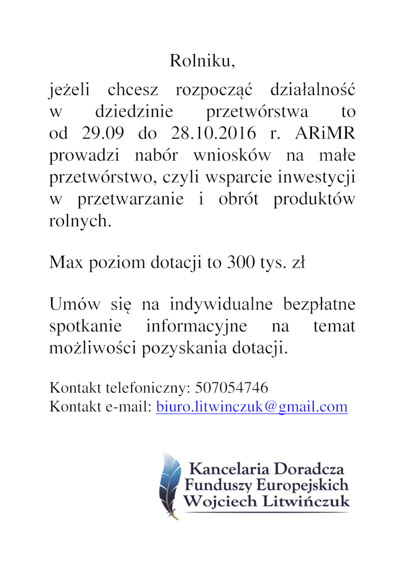 Wszyscy zainteresowani rozpoczeciem działalności w dziedzinie  przetwórstwa i obrotu produktów rolnych będą mogli skladać wnioski o dofinansowanie w ARiMR w dniach 29.09 - 28.10.2016 r.