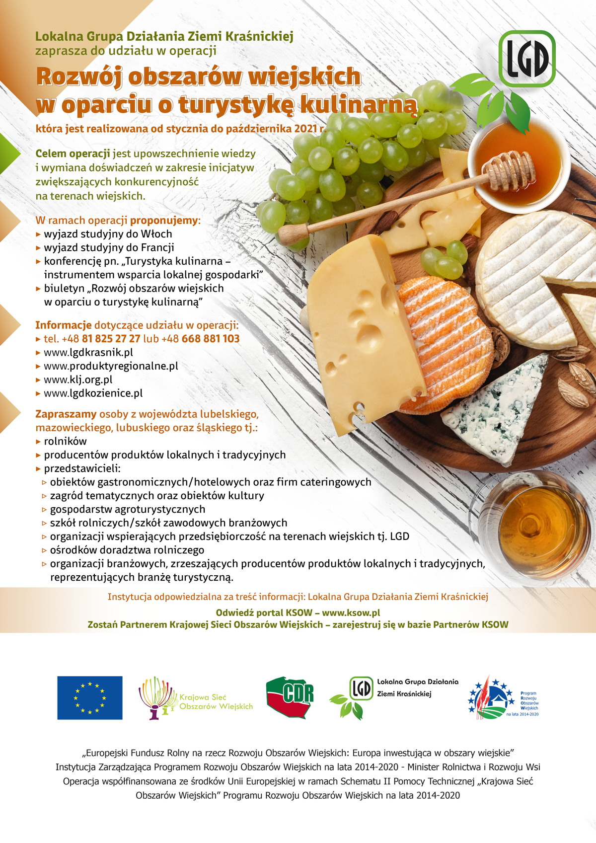 LOKALNA GRUPA DZIAŁANIA ZIEMI KRAŚNICKIEJ W PARTNERSTWIE Z POLSKĄ IZBĄ PRODUKTU REGIONALNEGO I LOKALNEGO W WARSZAWIE, STOWARZYSZENIEM KRAINA LASÓW I JEZIOR –LOKALNA GRUPA DZIAŁANIA ORAZ STOWARZYSZENIEM LOKALNA GRUPA DZIAŁANIA „PUSZCZA KOZIENICKA" ZAPRASZA DO UDZIAŁU W WYJEŹDZIE STUDYJNYM DO WŁOCH W RAMACH OPERACJI PN. „ROZWÓJ OBSZARÓW WIEJSKICH W OPARCIU O TURYSTYKĘ KULINARNĄ" W DNIACH 9-13 SIERPNIA 2021 ROKU