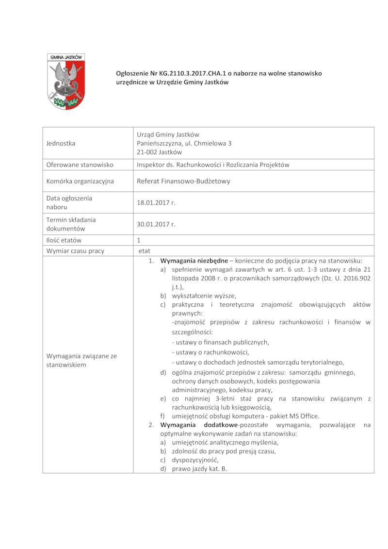 OGŁOSZENIE O NABORZE NA WOLNE STANOWISKO URZĘDNICZE W URZĘDZIE GMINY JASTKÓW - INSPEKTOR DS. RACHUNKOWOŚCI I ROZLICZANIA PROJEKTÓW W REFERACIE FINANSOWO-BUDŻETOWYM