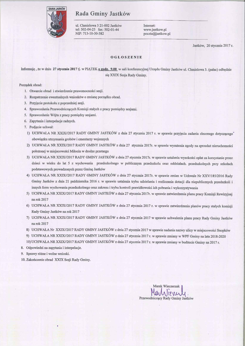 OGŁOSZENIE O XXIX SESJI RADY GMINY JASTKÓW W DNIU 27 STYCZNIA 2017 R