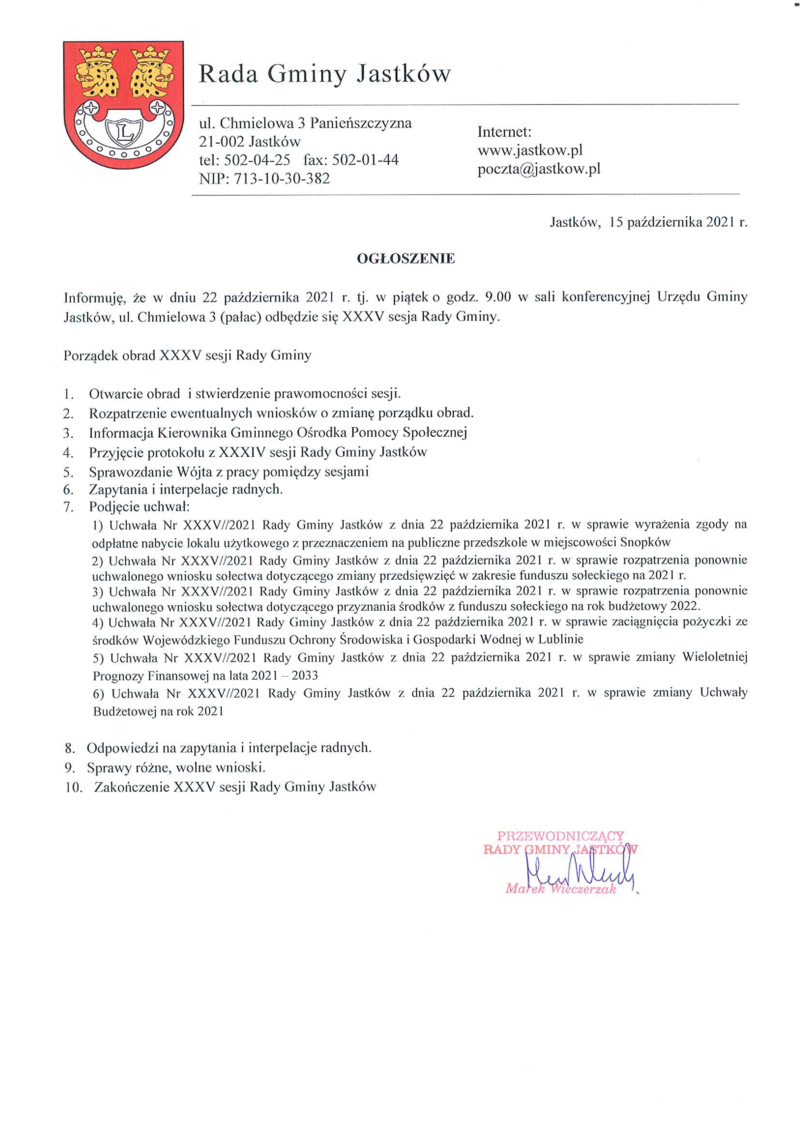 OGŁOSZENIE O XXXV SESJI RADY GMINY
