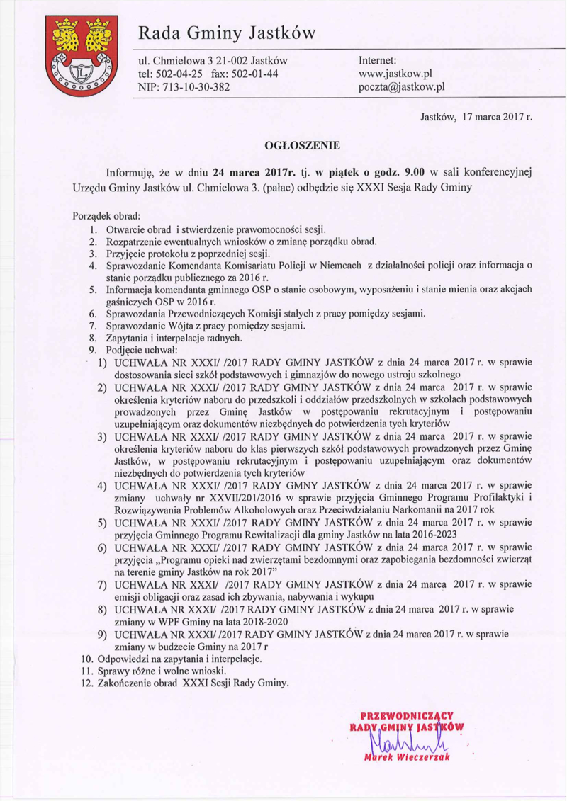 OGŁOSZENIE O XXXI SESJI RADY GMINY JASTKÓW W DNIU 24 MARCA 2017 ROKU.