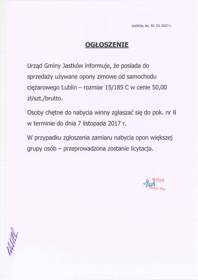 Urząd Gminy Jastków informuje, że ma na sprzedaż opony do samochodu ciężarowego Lublin.