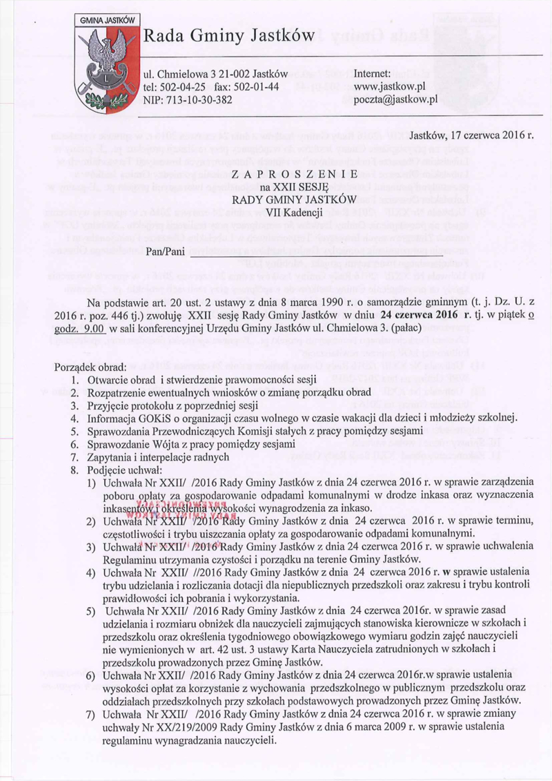 ZAPRASZAMY NA XXII SESJĘ RADY GMINY JASTKÓW, KTÓRA ODBĘDZIE SIĘ DNIA 24.06.2016 R.