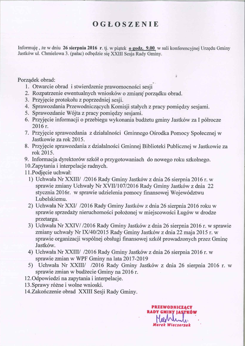 OGŁOSZENIE O XXIII SESJI RADY GMINY JASTKÓW
