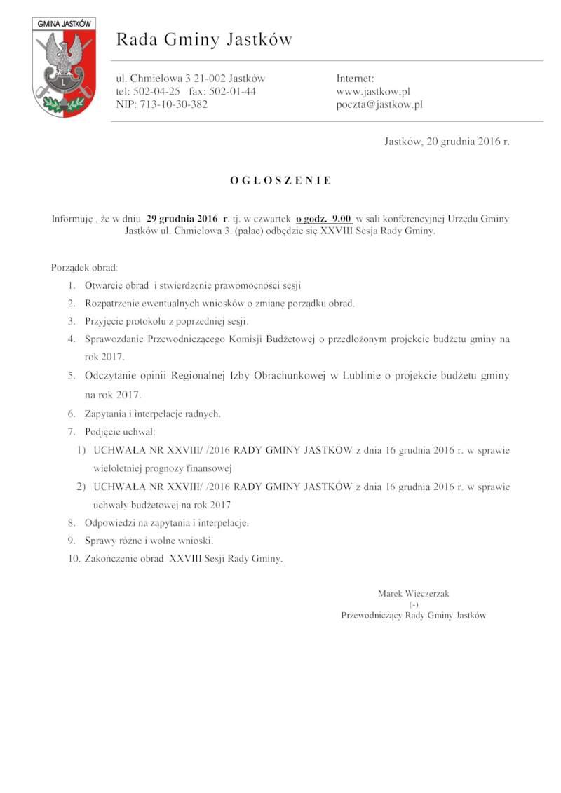 Zaproszenie na XXVIII sesję Rady Gminy Jastków w dniu 29 grudnia 2016