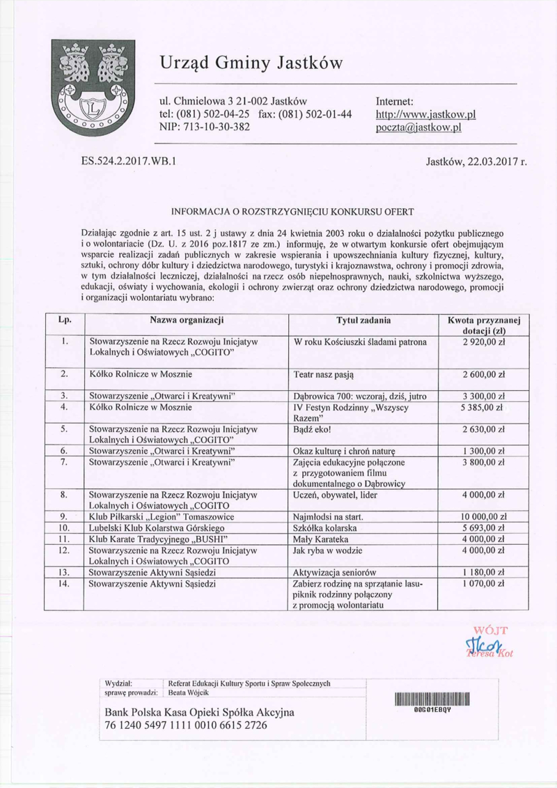 INFORMACJA O ROZSTRZYGNIĘCIU KONKURSU OFERT NA WSPARCIE WYKONANIA ZADAŃ PUBLICZNYCH W ROKU 2017 PRZEZ ORGANIZACJE PROWADZĄCE DZIAŁALNOŚĆ POŻYTKU PUBLICZNEGO NA TERENEI GMINY JASTKÓW