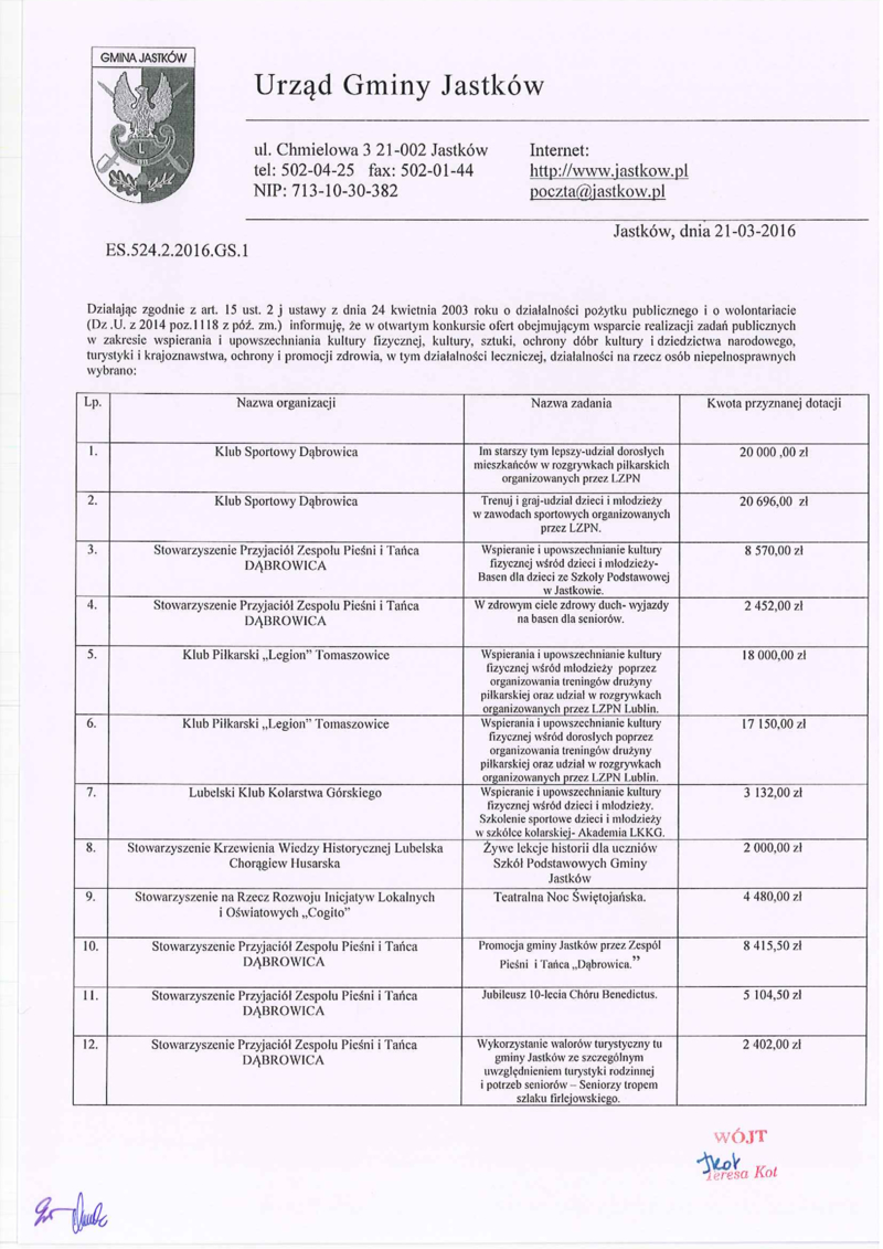 Informacja o rozstrzygnięciu otwartego konkursu ofert na realizację w 2016 roku zadań publicznych w zakresie wspierania i upowszechniania kultury fizycznej, kultury, sztuki, ochrony dóbr kultury i dziedzictwa narodowego, turystyki i krajoznawstwa, ochrony i promocji zdrowia, w tym działalności leczniczej, działalności na rzecz osób niepełnosprawnych.