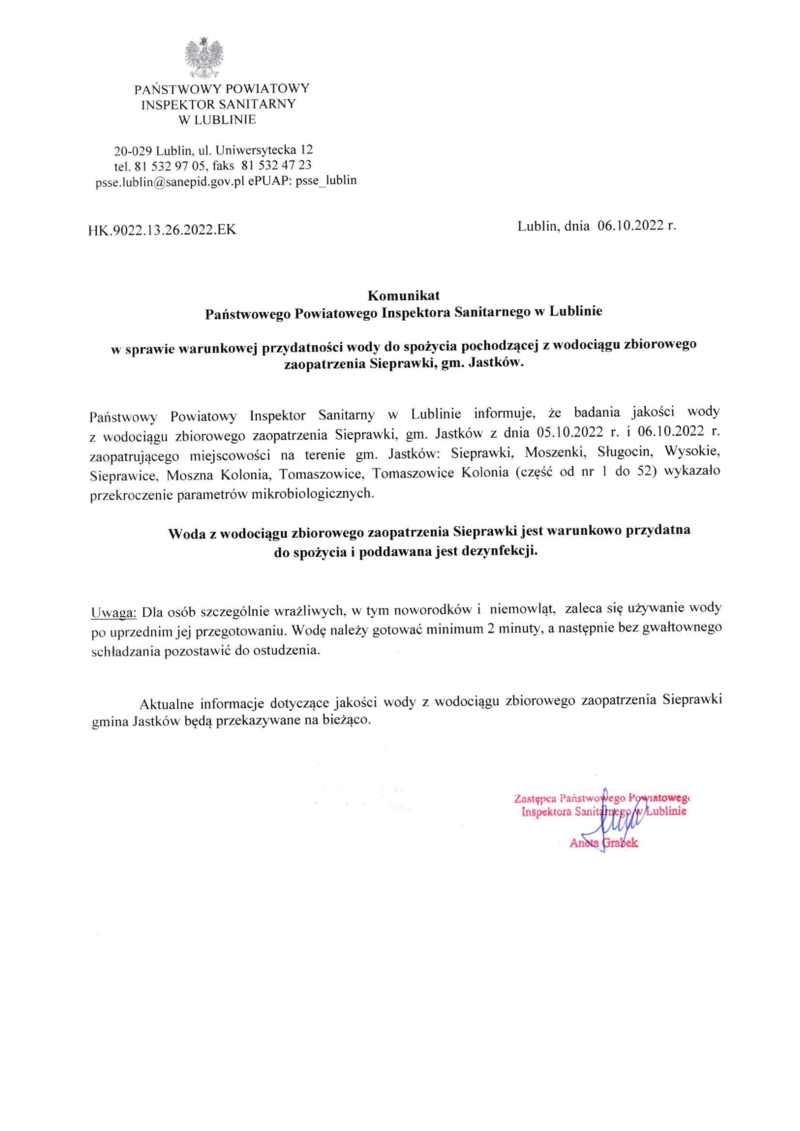 zawiadamia, że w związku z wykryciem parametru mikrobiologicznego w pobranej próbce wody z ujęcia w Sieprawkach woda podawana do sieci z ujęcia w Sieprawkach będzie chlorowana do momentu uzyskania właściwych wartości parametrów mikrobiologicznych, potwierdzonych przez Sanepid.
