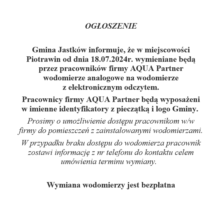 OGŁOSZENIE GMINA JASTKÓW INFORMUJE, ŻE W MIEJSCOWOŚCI PIOTRAWIN OD DNIA 18.07.2024R. WYMIENIANE BĘDĄ PRZEZ PRACOWNIKÓW FIRMY AQUA PARTNER WODOMIERZE ANALOGOWE NA WODOMIERZE Z ELEKTRONICZNYM ODCZYTEM.