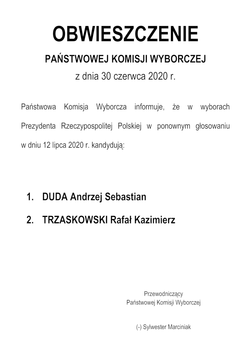 OBWIESZCZENIE PAŃSTWOWEJ KOMISJI WYBORCZEJ Z DNIA 30 CZERWCA 2020 R.