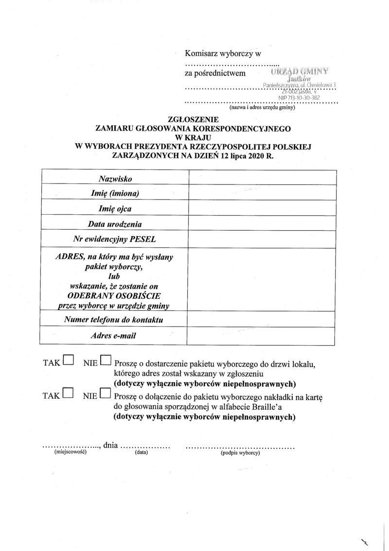 WZÓR ZGŁOSZENIE GŁOSOWANIE KORESPONDENCYJNE II TURA