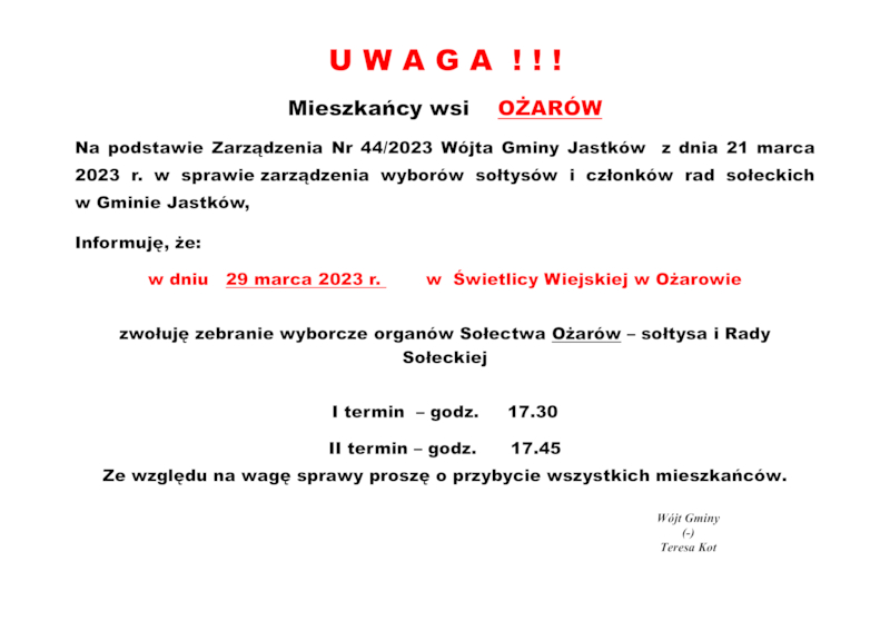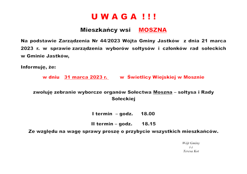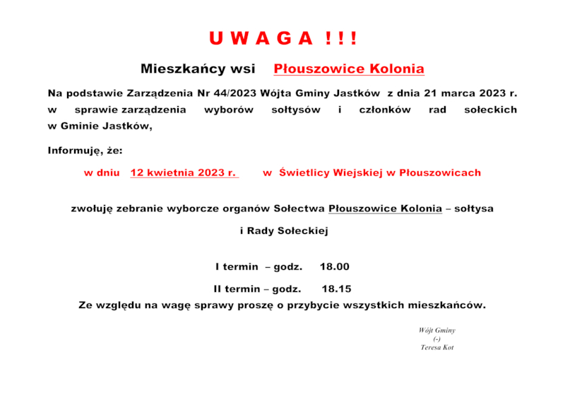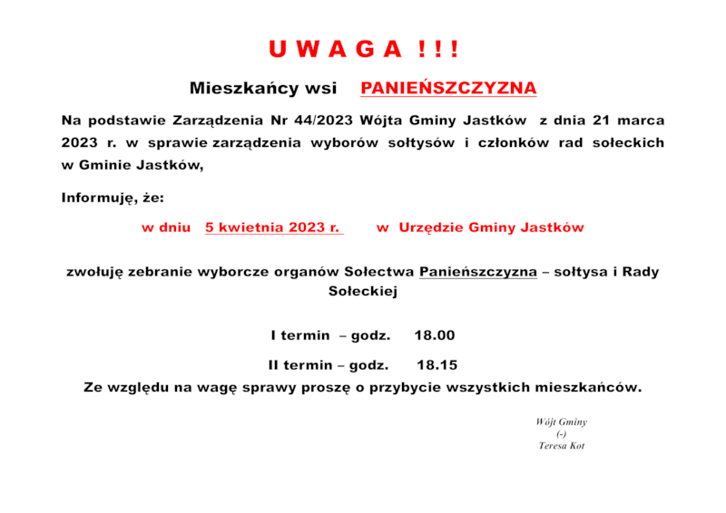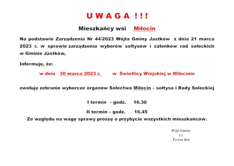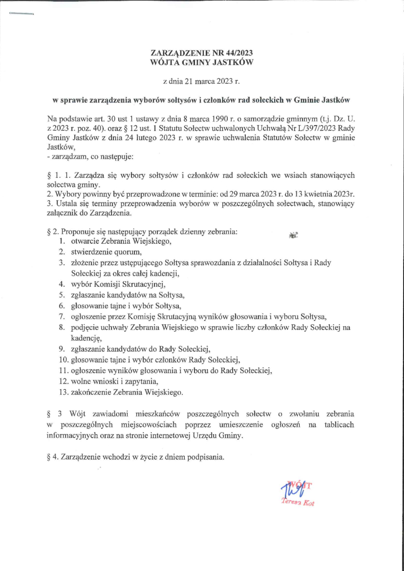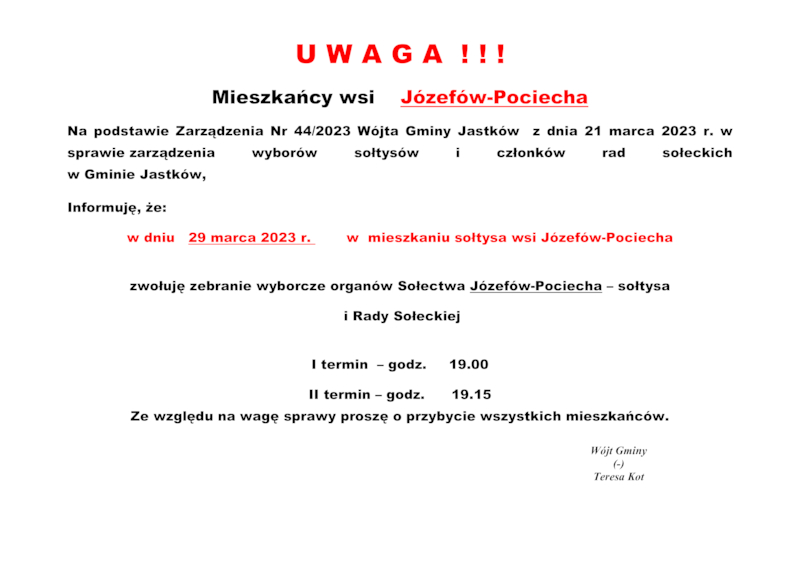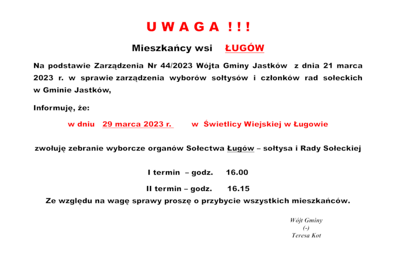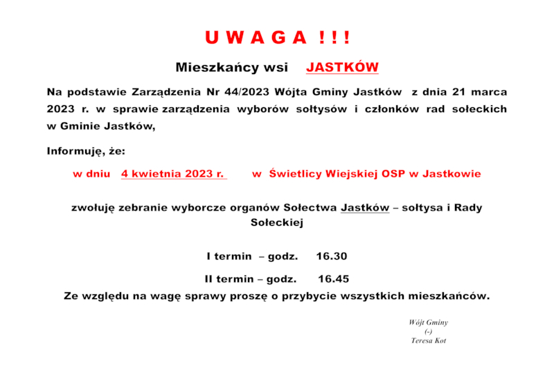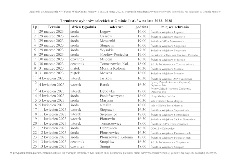 INFORMACJE WÓJTA GMINY JASTKÓW O TERMINACH WYBORÓW NA SOŁTYSA ORAZ RADY SOŁECKIEJ W SOŁECTWACH GMINY JASTKÓW