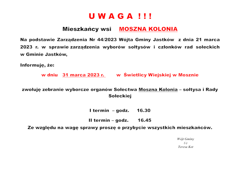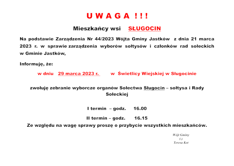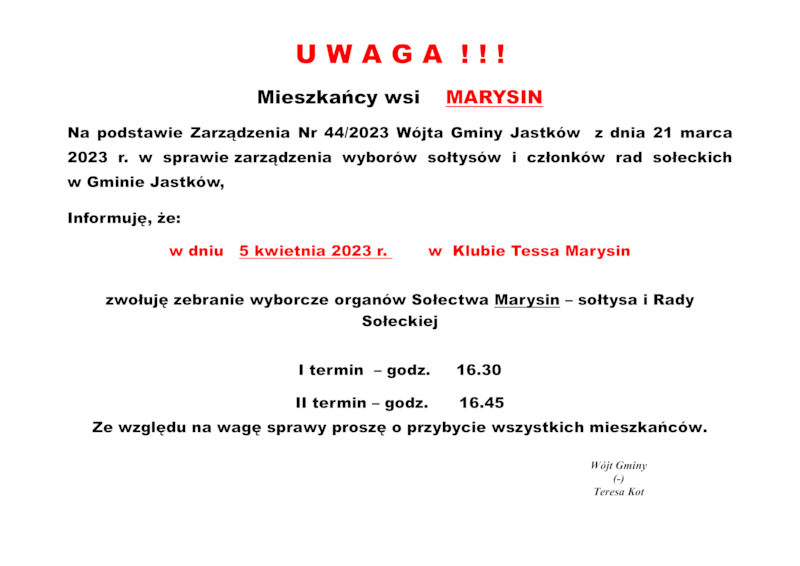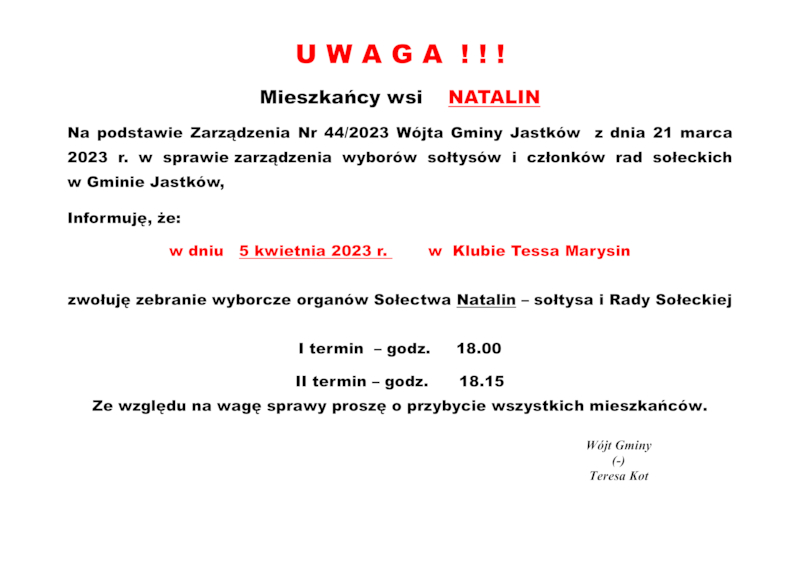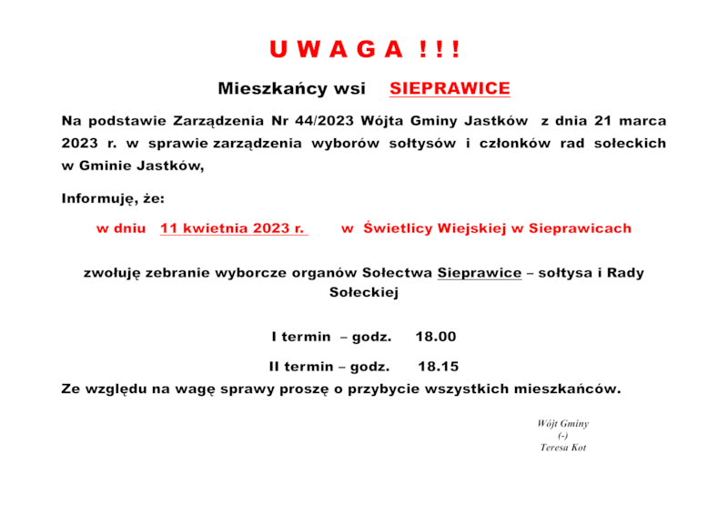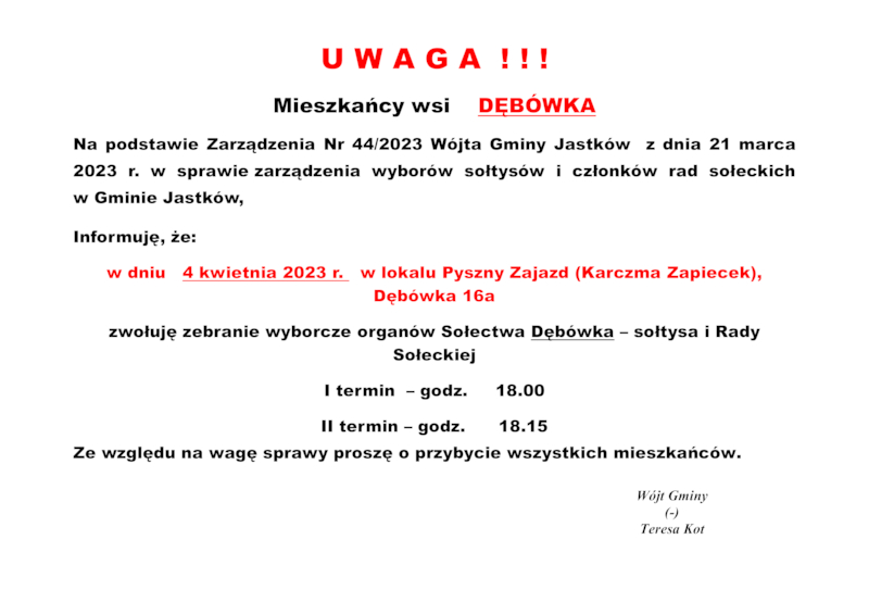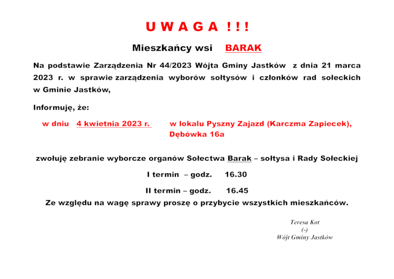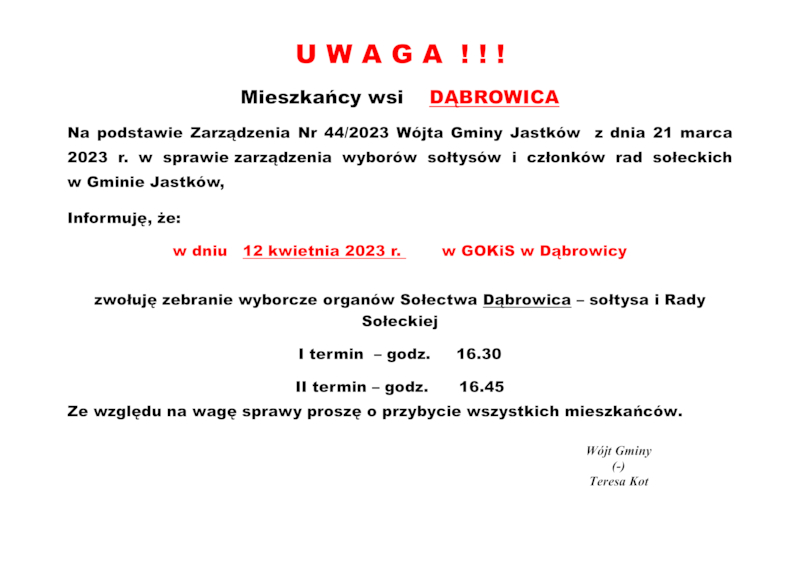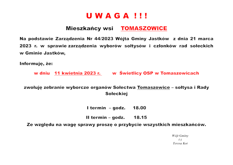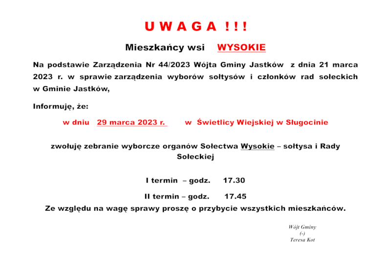 INFORMACJE WÓJTA GMINY JASTKÓW O TERMINACH WYBORÓW NA SOŁTYSA ORAZ RADY SOŁECKIEJ W SOŁECTWACH GMINY JASTKÓW