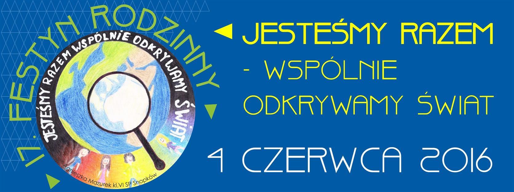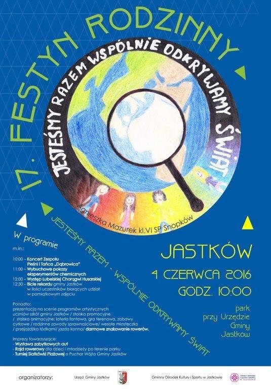 Jastków 4 czerwca 2016 godz. 1000 w parku przy Urzędzie Gminy Jastków startuje 17. Festyn Rodzinny pn. "Jesteśmy Razem - Wspólnie Odkrywamy Świat."