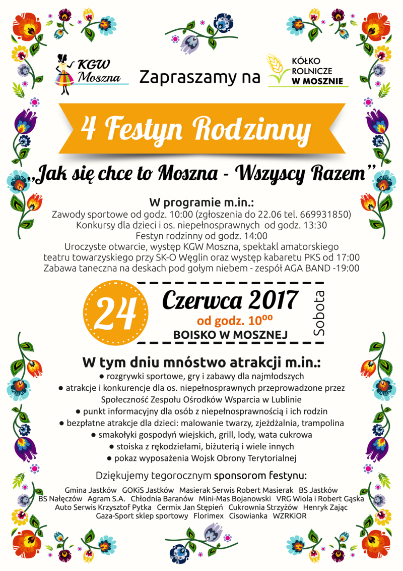 Kółko Rolnicze i Koło Gospodyń Wiejskich zapraszają wszystkich mieszkańców Gminy Jastków na IV Festyn Rodzinny - WSZYSCY RAZEM, który odbędzie się 24.06.2017r. w Mosznej