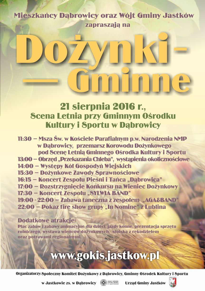 Mieszkańcy Dąbrowicy oraz Wójt Gminy Jastków zapraszają na Dożynki Gminne 21 sierpnia 2016 r.