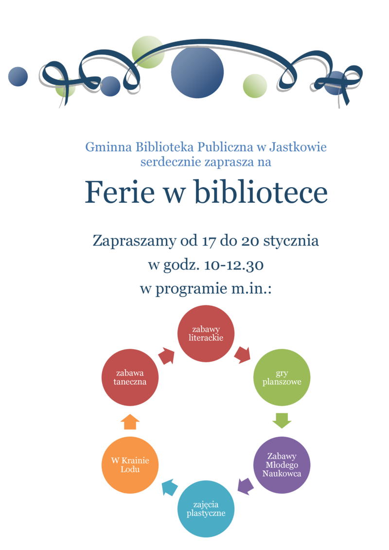 Gminna Biblioteka Publiczna w Jastkowie serdecznie zaprasza na Ferie w bibliotece Zapraszamy od 17 do 20 stycznia w godz. 10-12.30