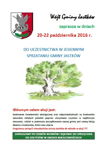 Wójt Gminy Jastków zaprasza w dniach 20-22 października 2016 r. do uczestnictwa w jesiennym sprzataniu Gminy Jastków