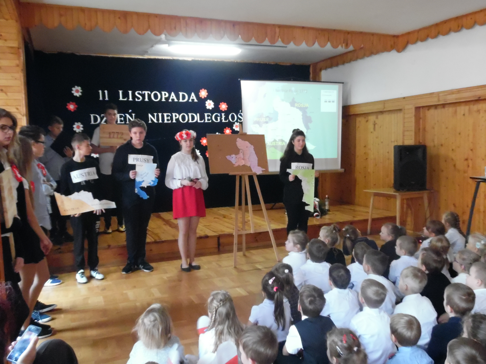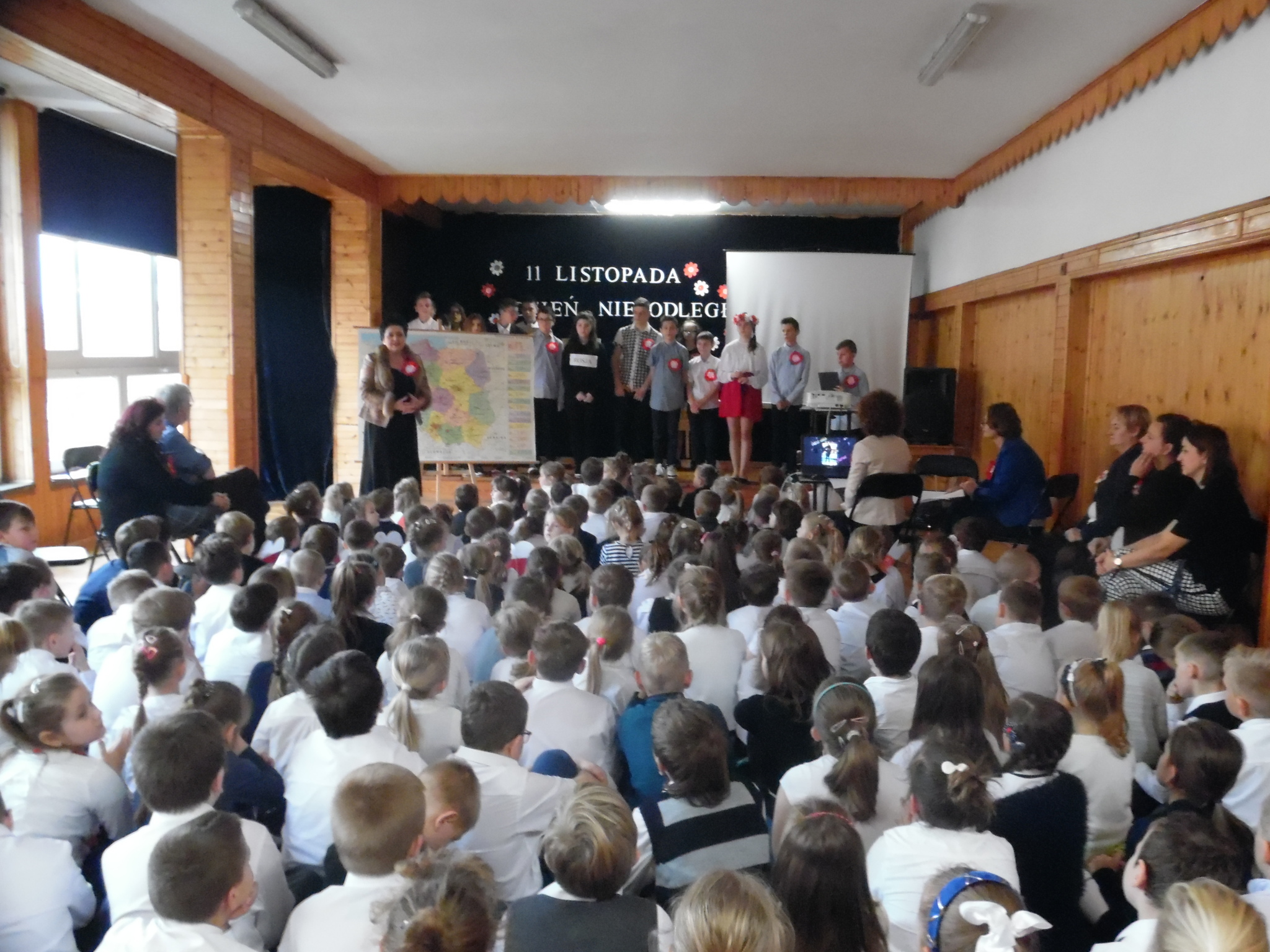 W dniu 9 listopada 2017 roku odbyła się pierwsza część uroczystości z okazji Święta Niepodległości. Uczniowie z klas 7B i 7C przedstawili swoim młodszym kolegom i koleżankom z oddziałów przedszkolnych i klas 1–3 wydarzenia historyczne związane z odzyskaniem niepodległości. Dzieci wysłuchały montażu słowno-muzycznego, podczas którego dowiedziały się jak przebiegały rozbiory Polski. Następnie przedstawiciele klas siódmych wraz z klasami młodszymi złożyli wieńce i zapalili znicze na Cmentarzu Legionistów aby uczcić pamięć Polaków walczących o naszą niepodległość. (Wioletta Guz – nauczyciel matematyki)