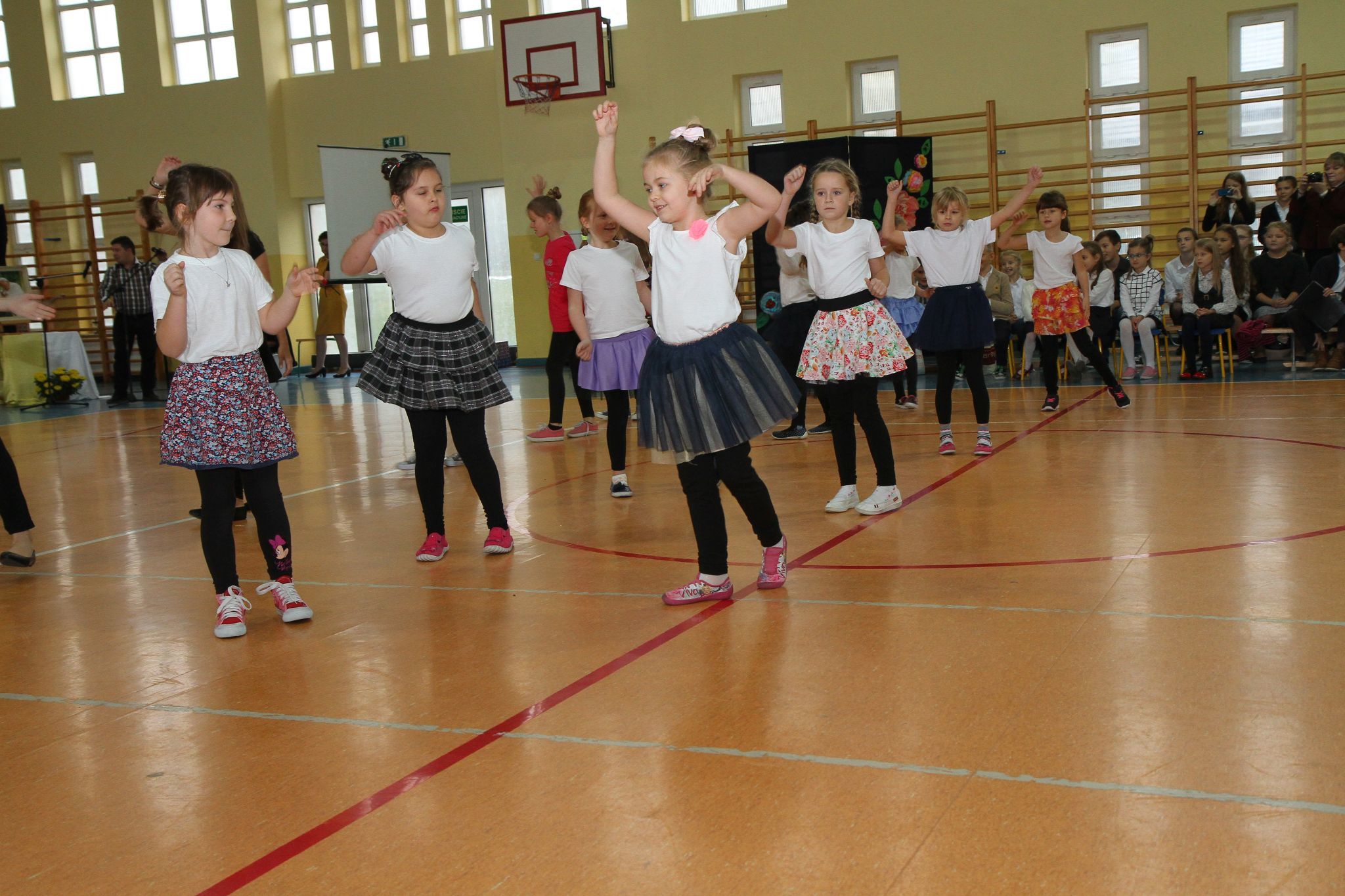 Na koniec programu artystycznego zaprezentowali się tancerze z klas II b oraz V, przygotowani przez panie: Jolantę Pyszniak, Irminę Kruszyńską-Bielak oraz instruktora tańca, panią Annę Chrzan. Uczniowie wykonali kilka żywiołowych układów choreograficznych w zespole oraz jeden taniec solowy w wykonaniu uczennicy klasy piątej, Oliwii Ostrowskiej.