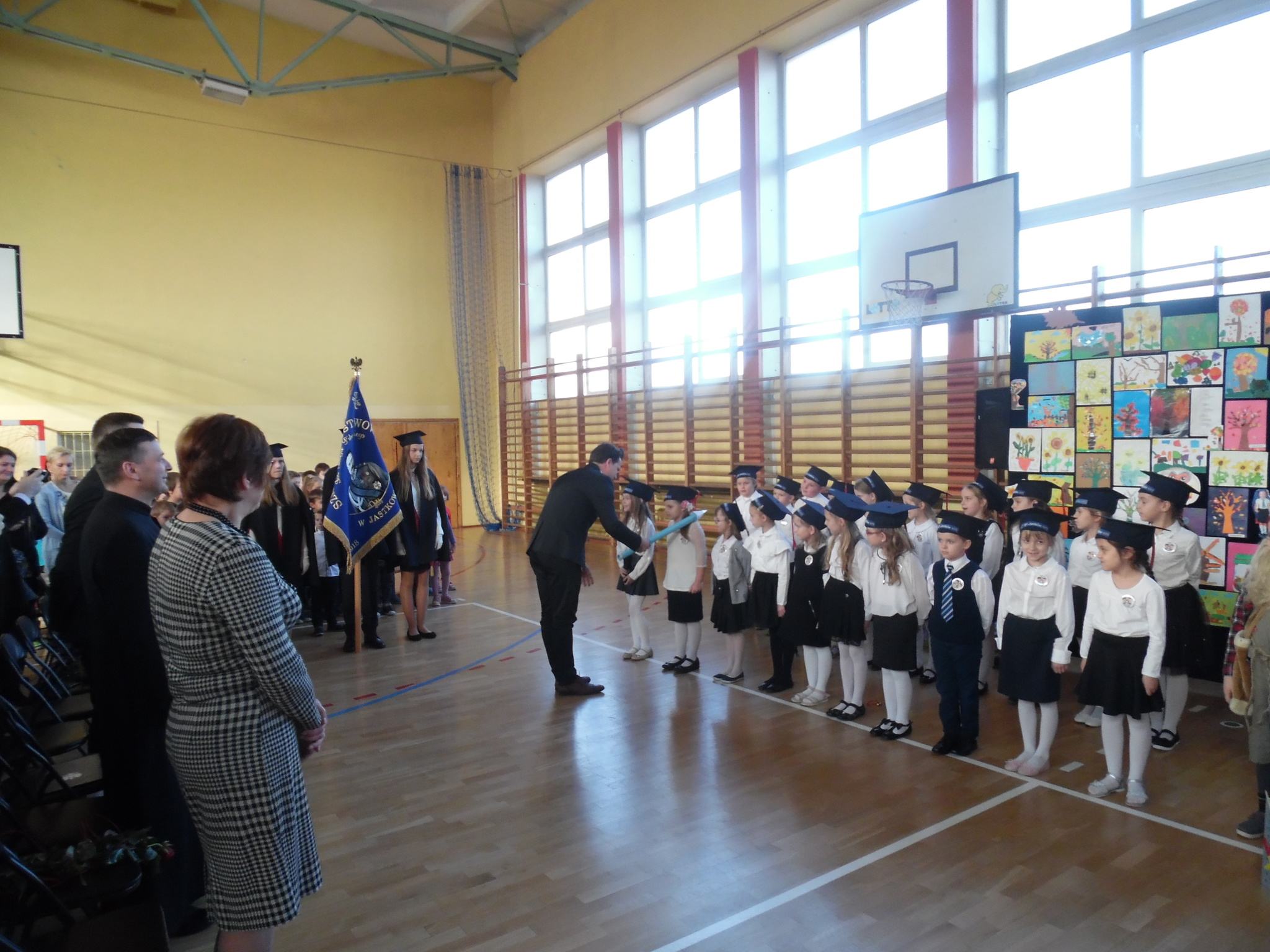 Najważniejszym momentem tej uroczystości było uroczyste ślubowanie i pasowanie na uczniów, którego dokonali: Pani Dyrektor Ewa Depta i Zastępca Wójta Gminy Jastków, Pan Andrzej Dec.