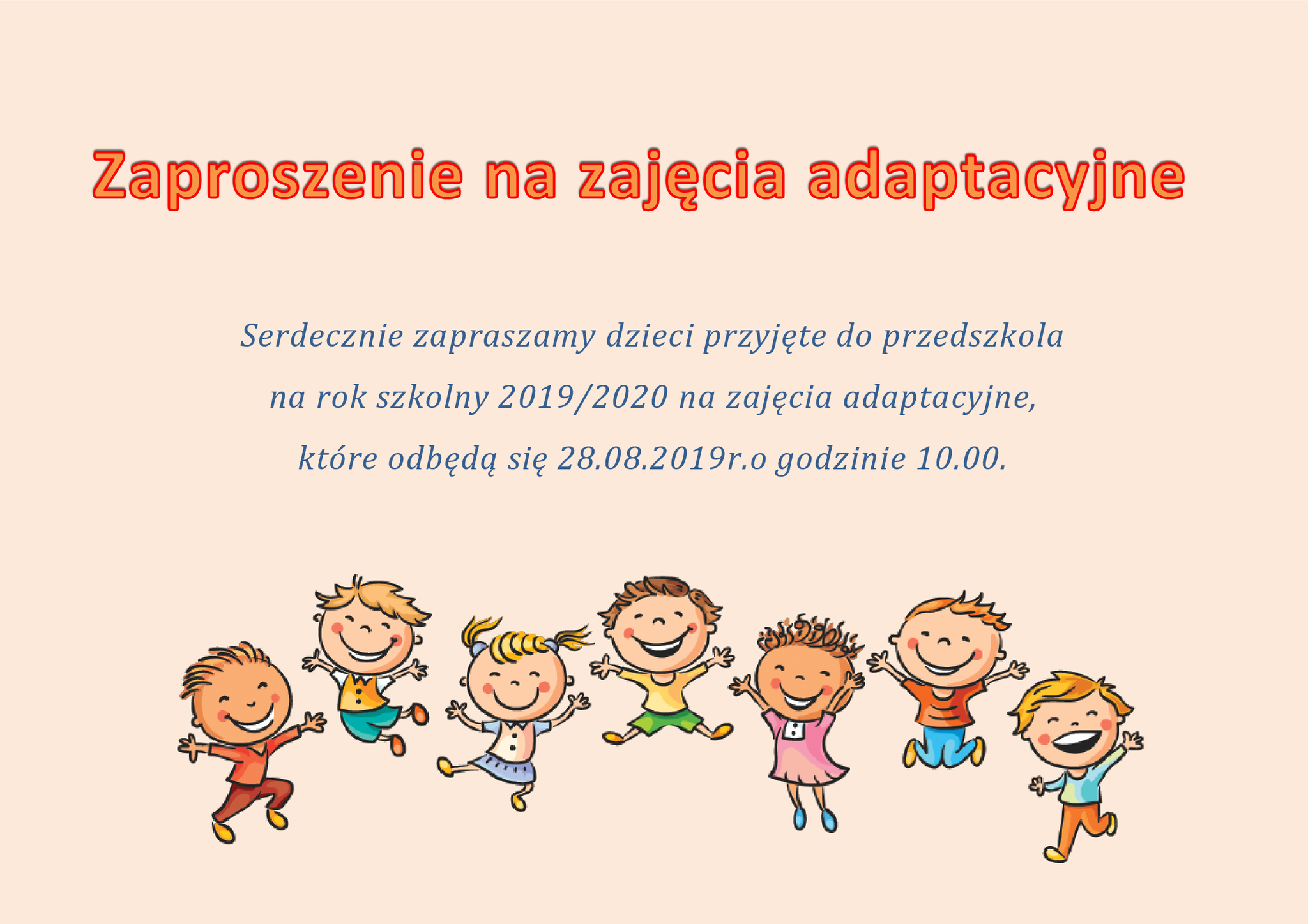 Serdecznie zapraszamy dzieci przyjęte do przedszkola na rok 2019/2020 na zajęcia adaptacyjne, które odbędzie się 28.08.2019 r. o godzinie 10:00