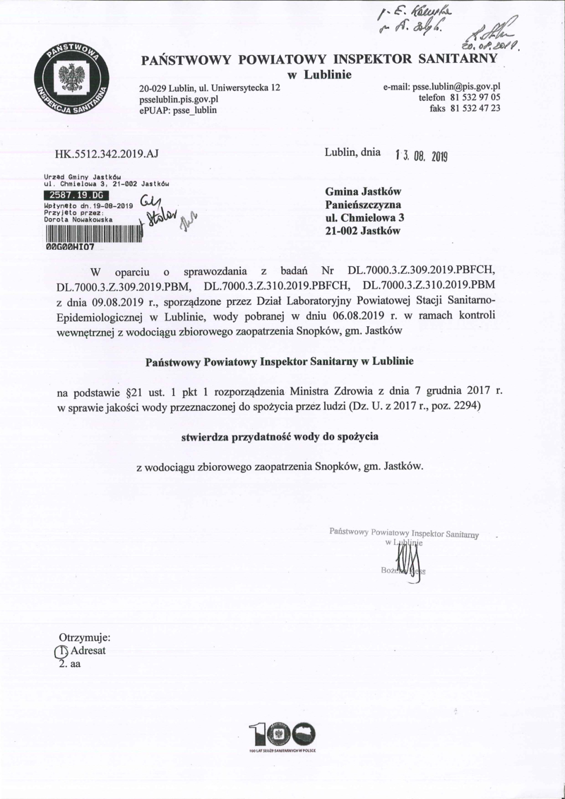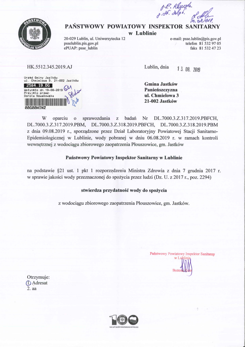 SPAWOZDANIA Z BADAŃ PAŃSTWOWEGO POWIATOWEGO INSPEKTORATU SANITARNEGO Z DN. 13.08.2019 R.