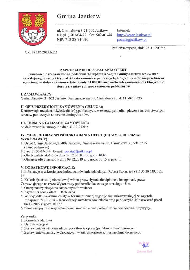 Konserwacja oświetlenia dróg publicznych, wewnętrznych, ulic, placów i innych otwartych terenów publicznych na terenie Gminy Jastków.