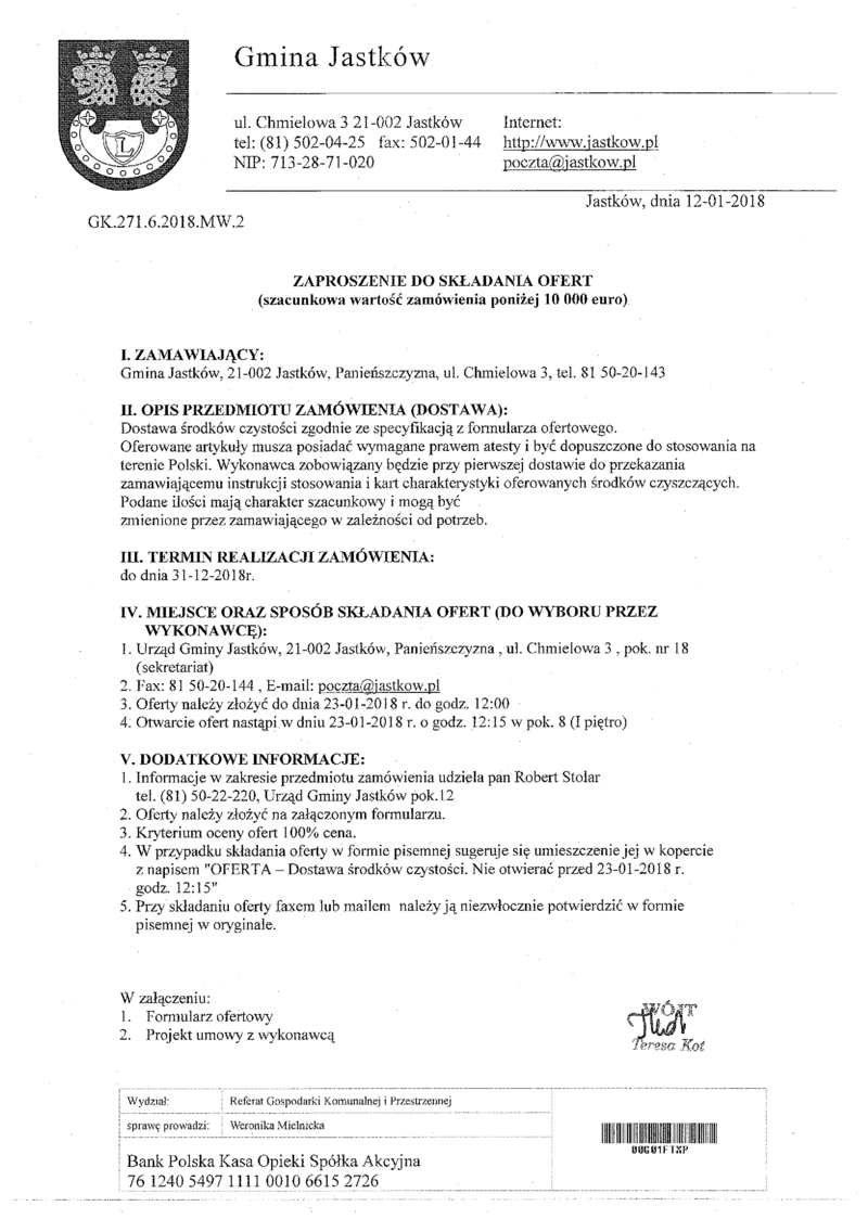 ZAPROSZENIE DO SKŁADANIA OFERT NA DOSTAWĘ ŚRODKÓW CZYSTOŚCI